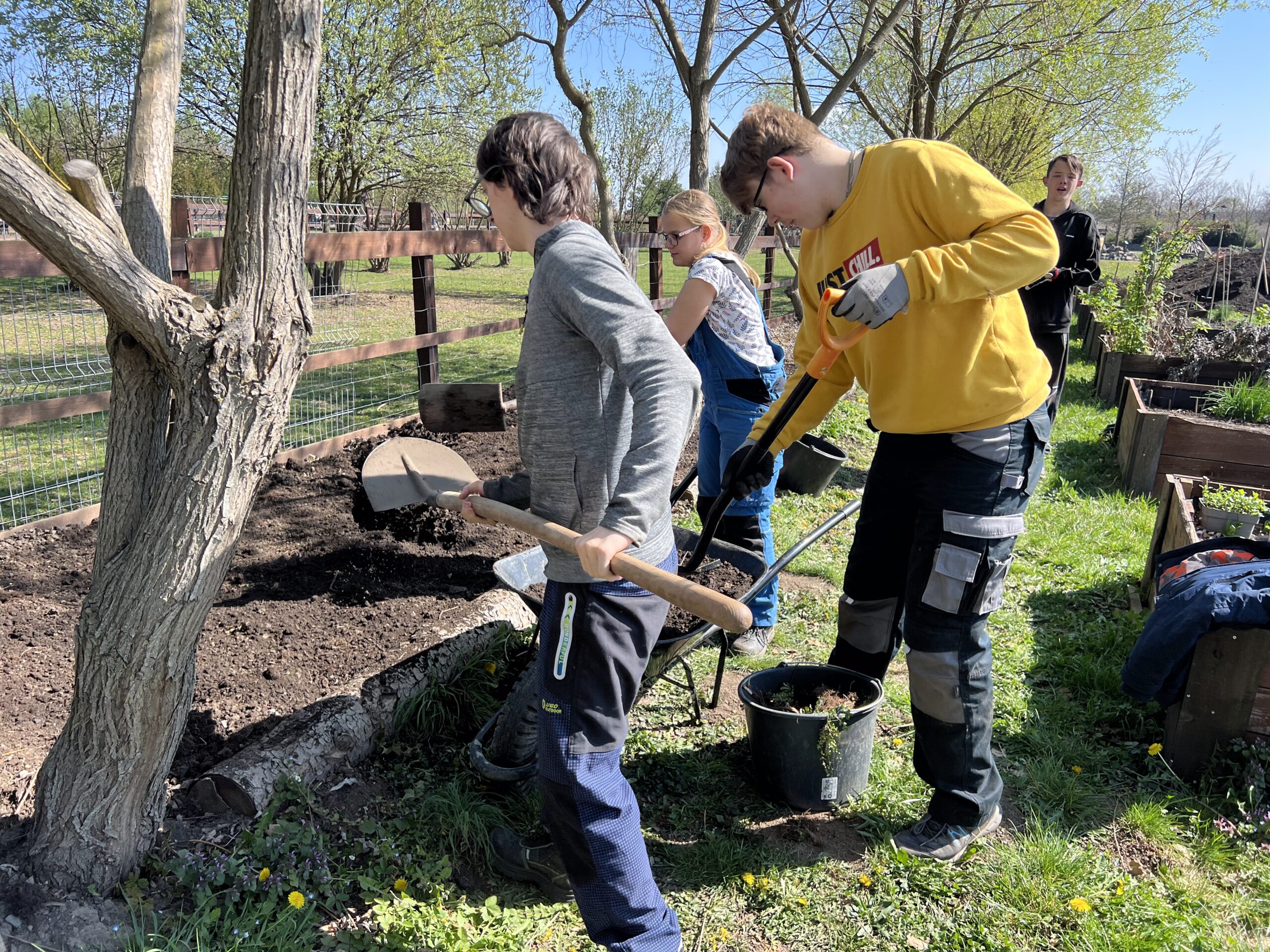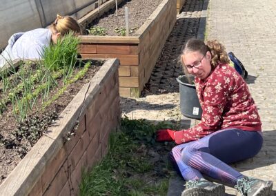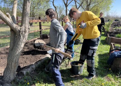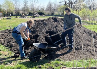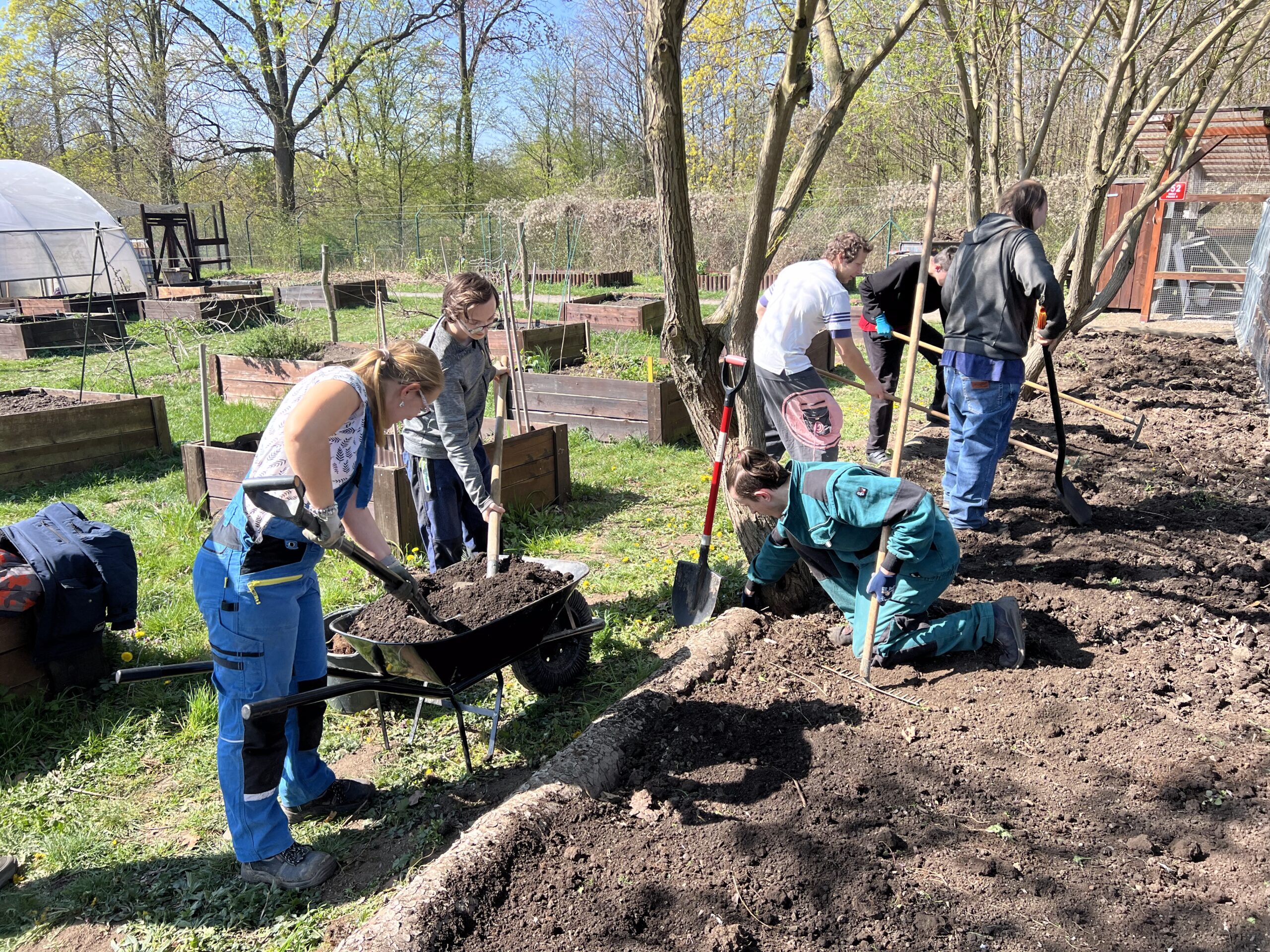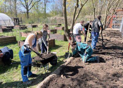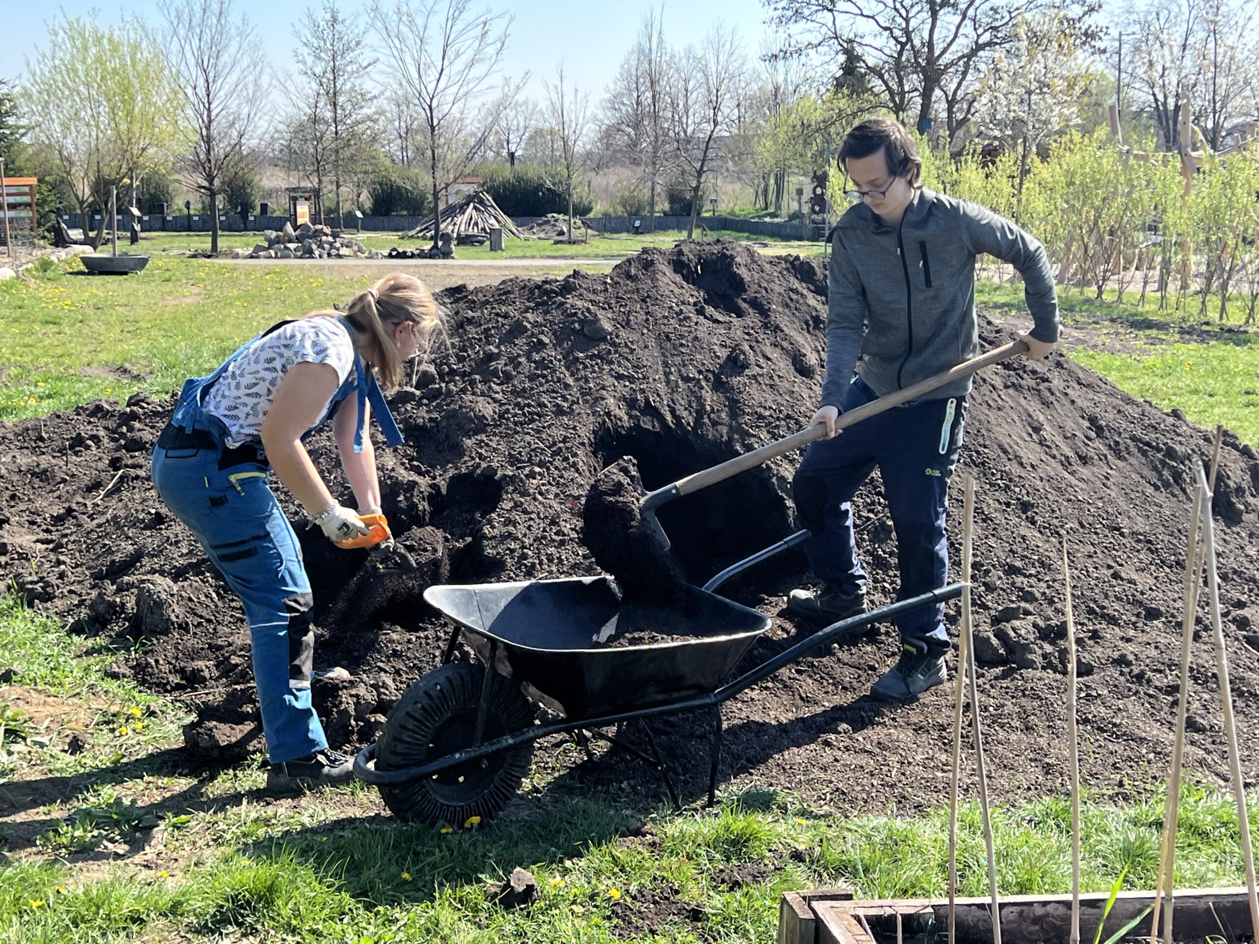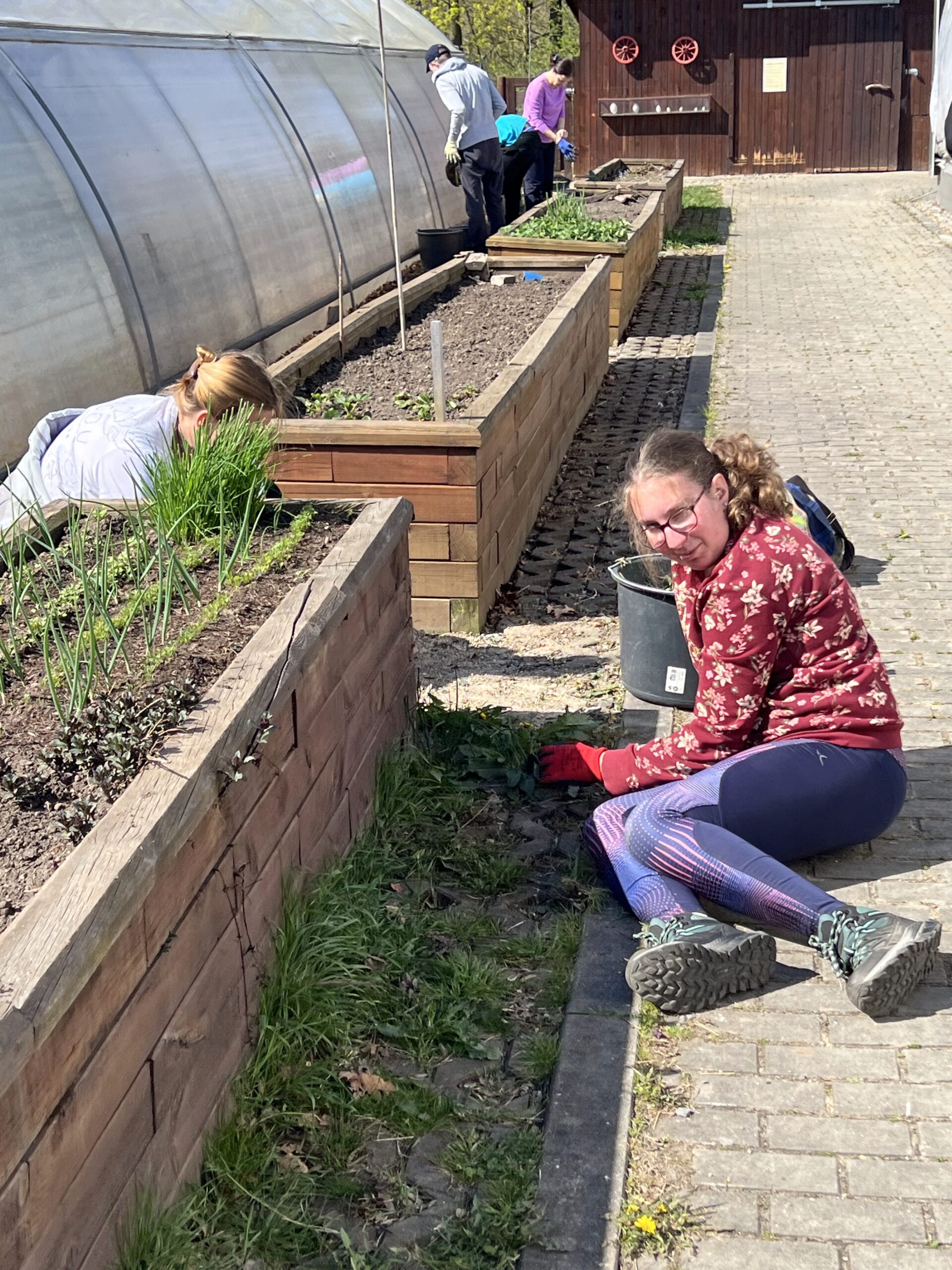 Ale pracovali jsme i v Paprsku, kde stavíme nové vyvýšené záhony. Do nich bylo třeba navozit plno nové zeminy a založit krásné nové záhony pro pěstování kytiček a zeleniny.