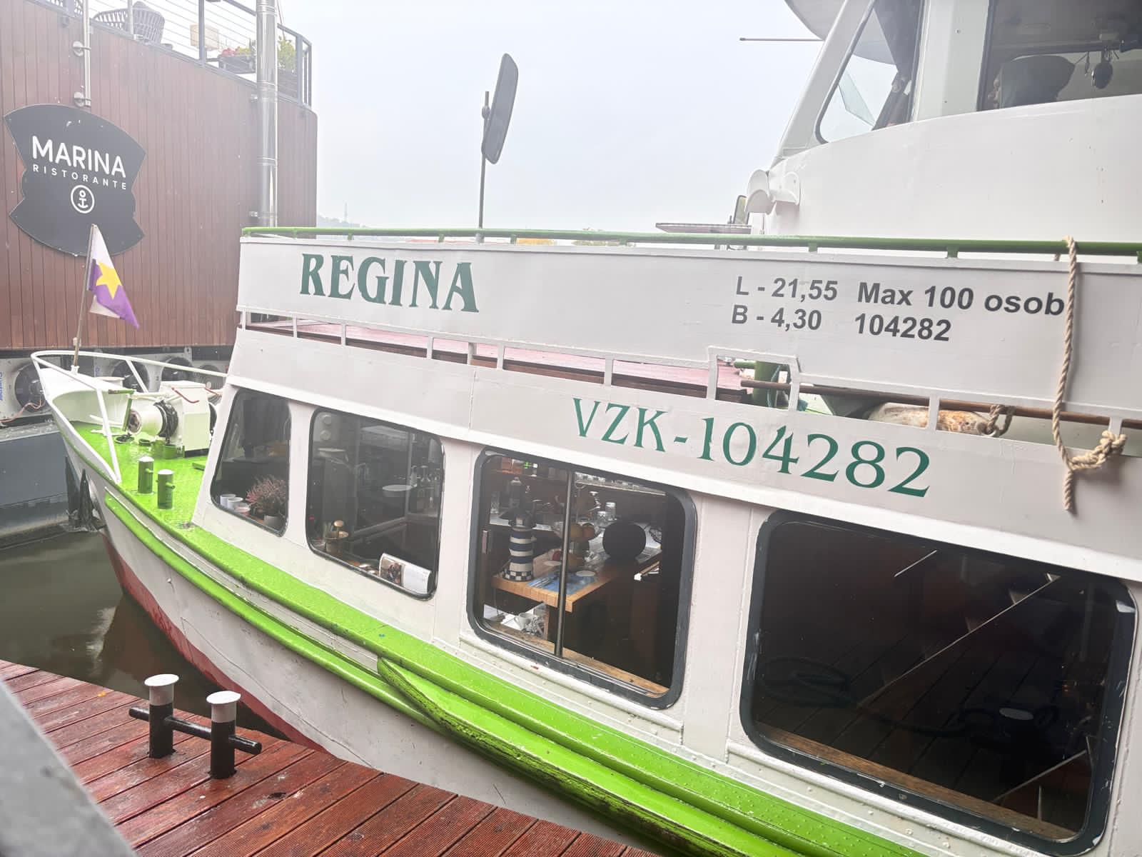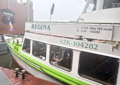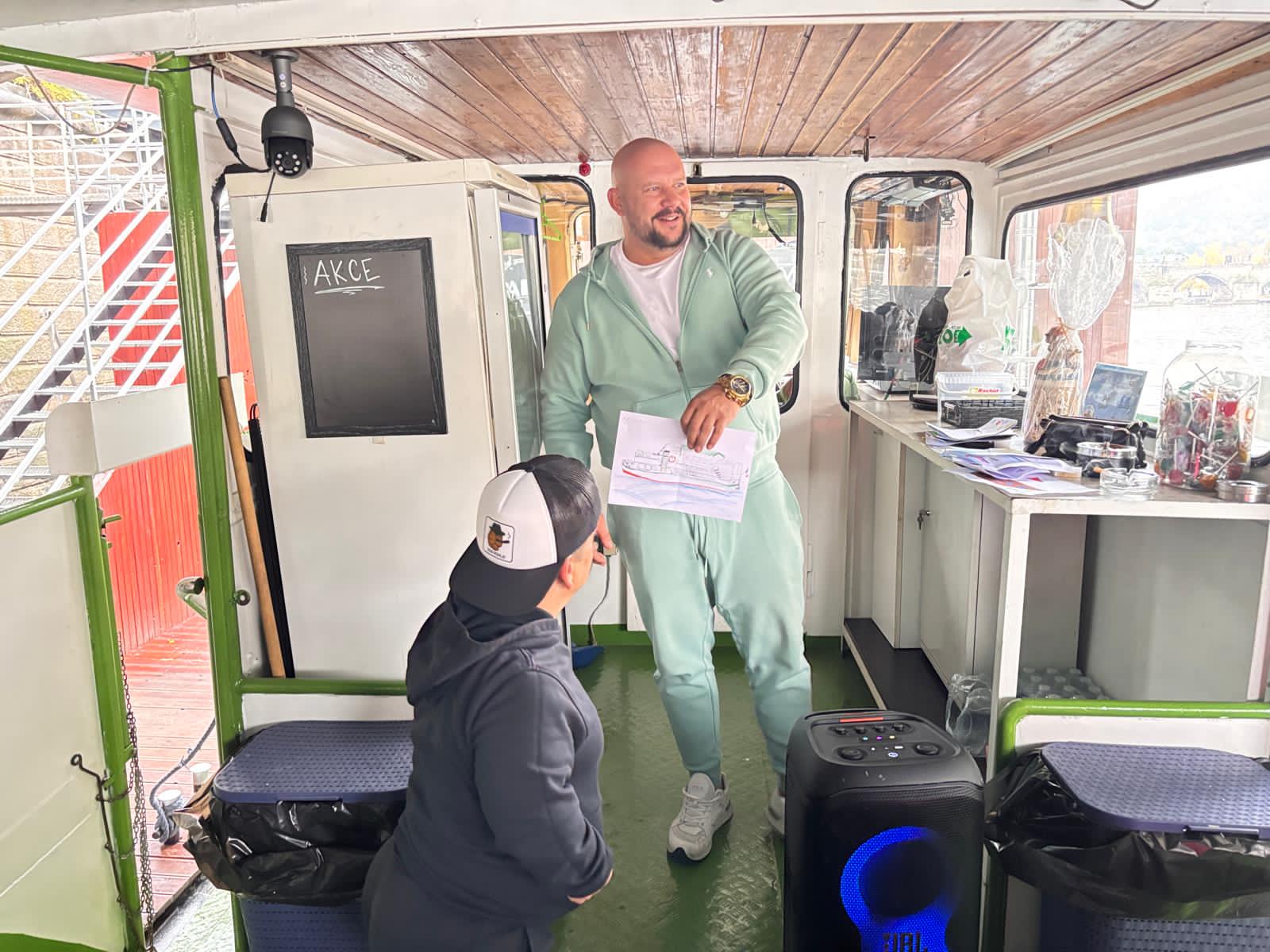 Metrem jsme se přesunuli k Mánesovu mostu, kde už na nás čekala loď Regina. Uvítal nás sám pan kapitán se svou posádkou, kteří pro nás navíc připravili i bohaté občerstvení – velké překvapení! Žáci předali obrázky a také keramickou sošku na památku.