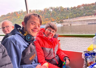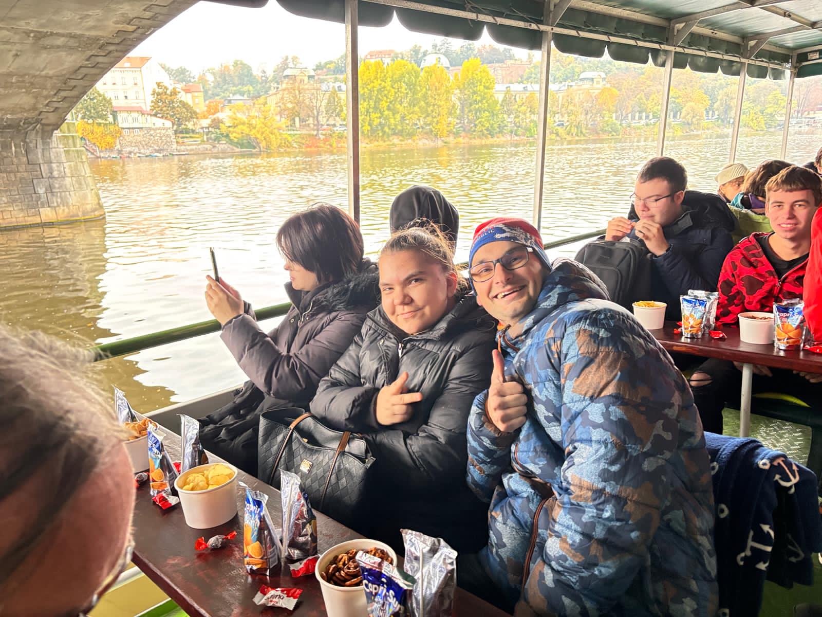 Jakmile se spustily motory, začala naše krásná plavba Prahou. Z reproduktorů se ozývaly zajímavé informace o historických budovách podél nábřeží, a tak jsme se nejen plavili, ale i učili. Atmosféra na palubě byla skvělá a nikomu nevadil ani drobný déšť, který nás po cestě zastihl.