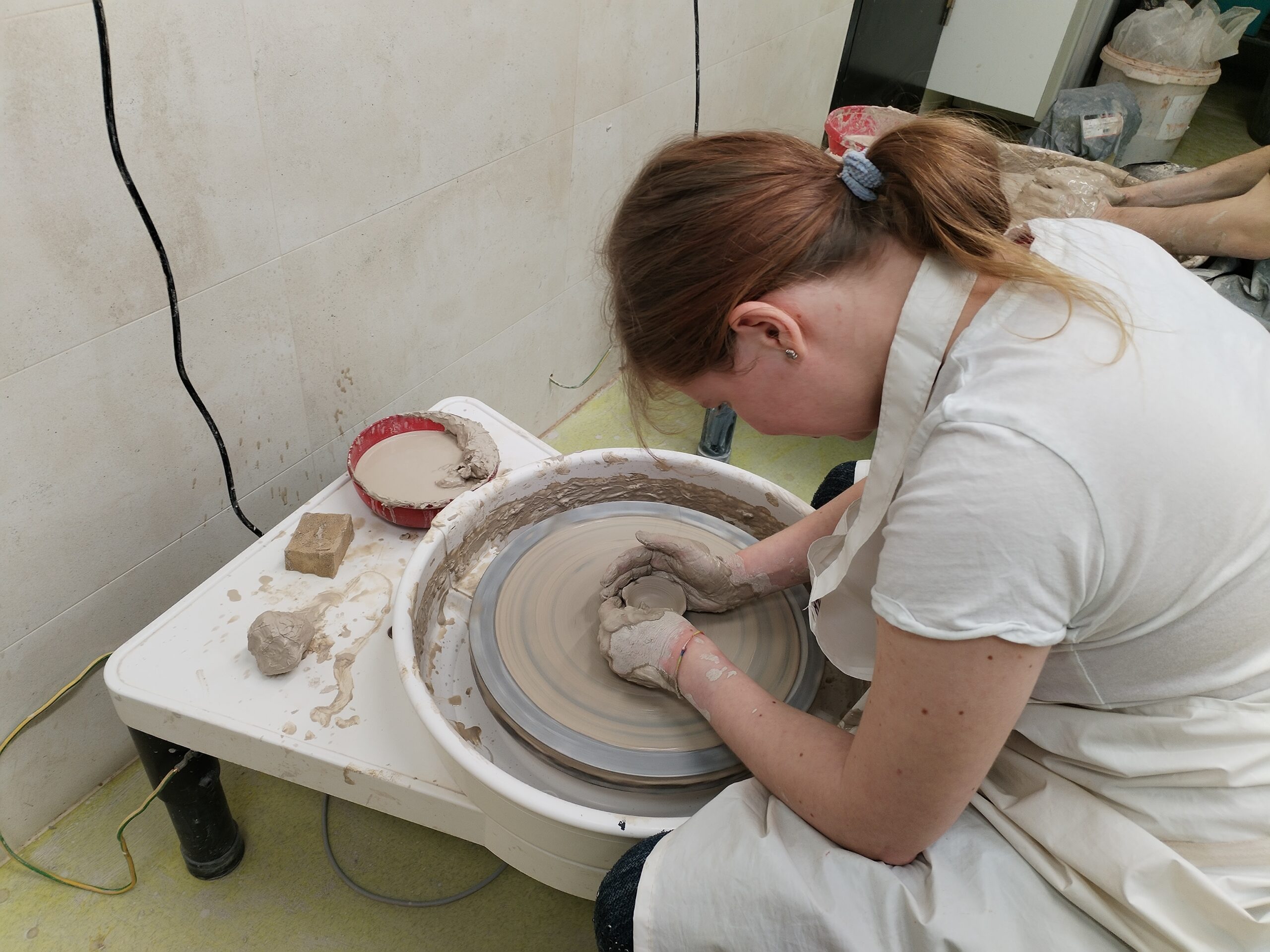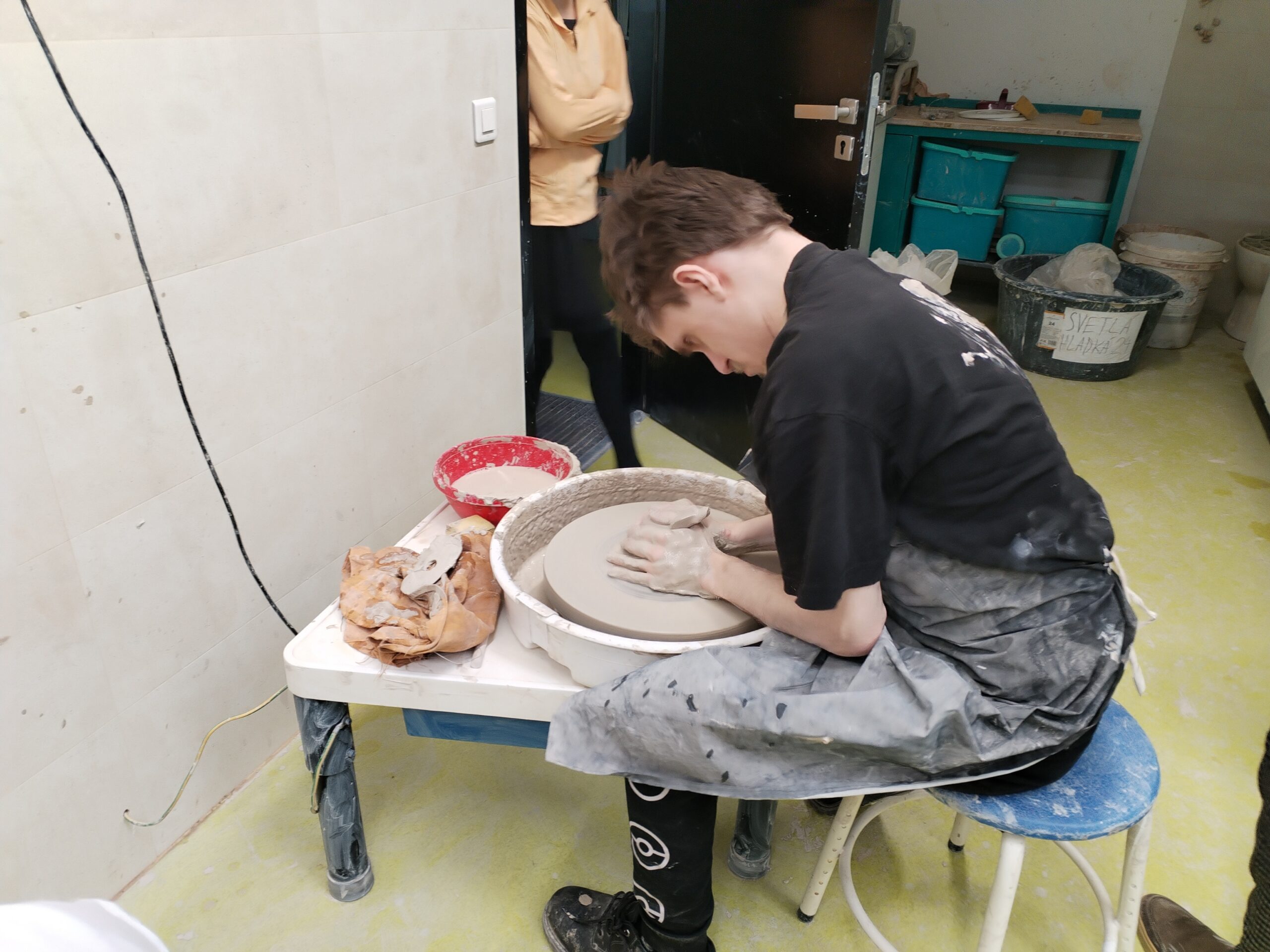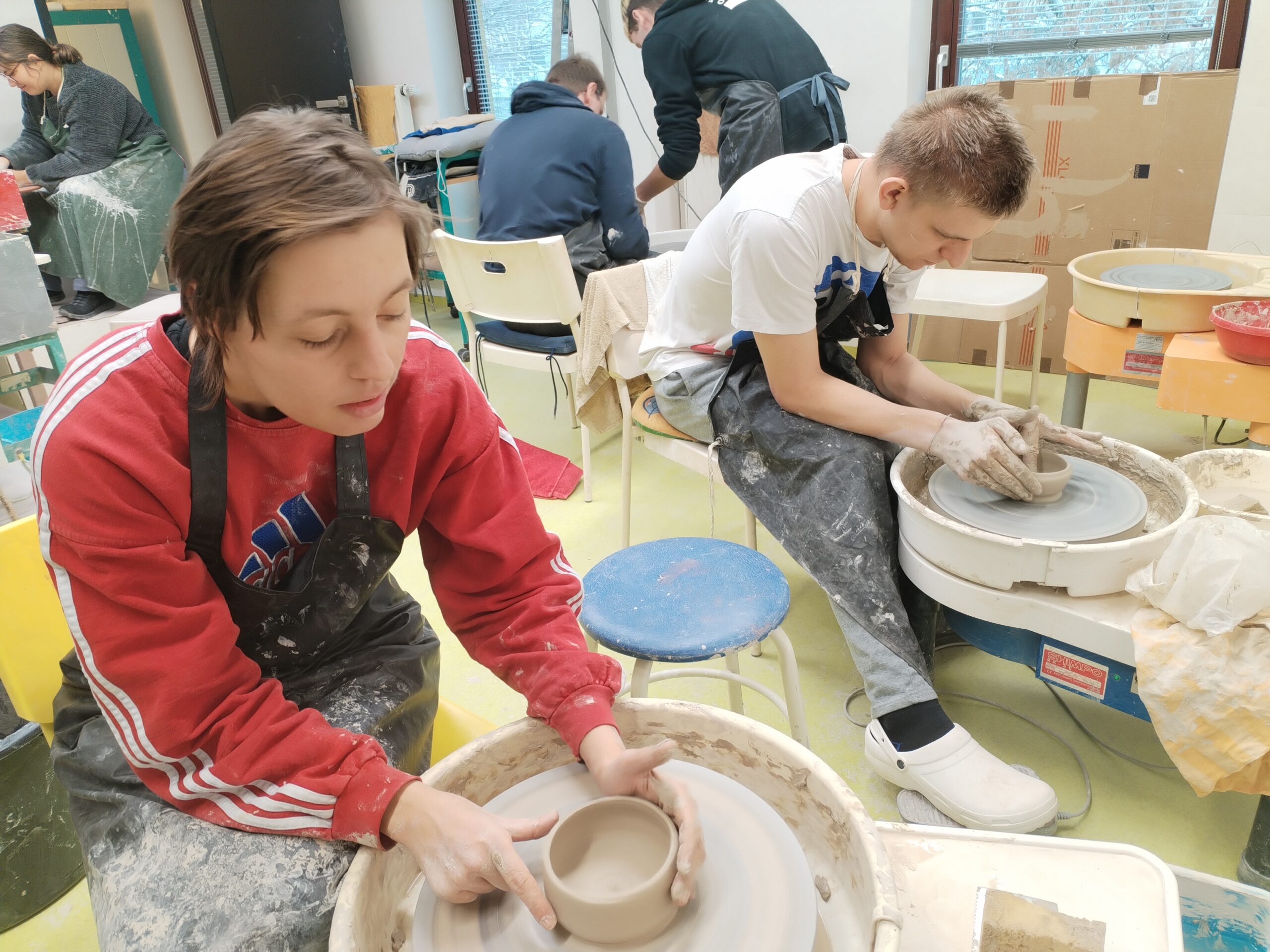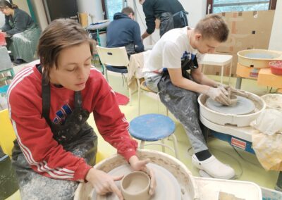 V rámci všech ročníků docházíme jednou týdně do točírny, kde se věnujeme práci na hrnčířském kruhu. Postupně se učíme základní hmaty, správné držení rukou i techniku centrování hlíny. Právě dobrý „centr“ je pro další práci klíčový, a proto se snažíme o co nejlepší zvládnutí této dovednosti.