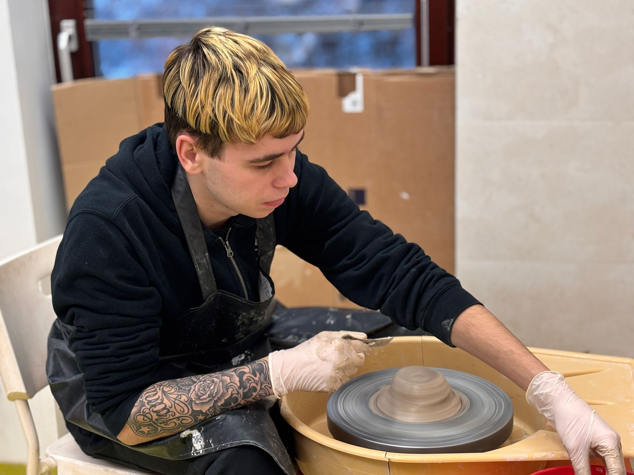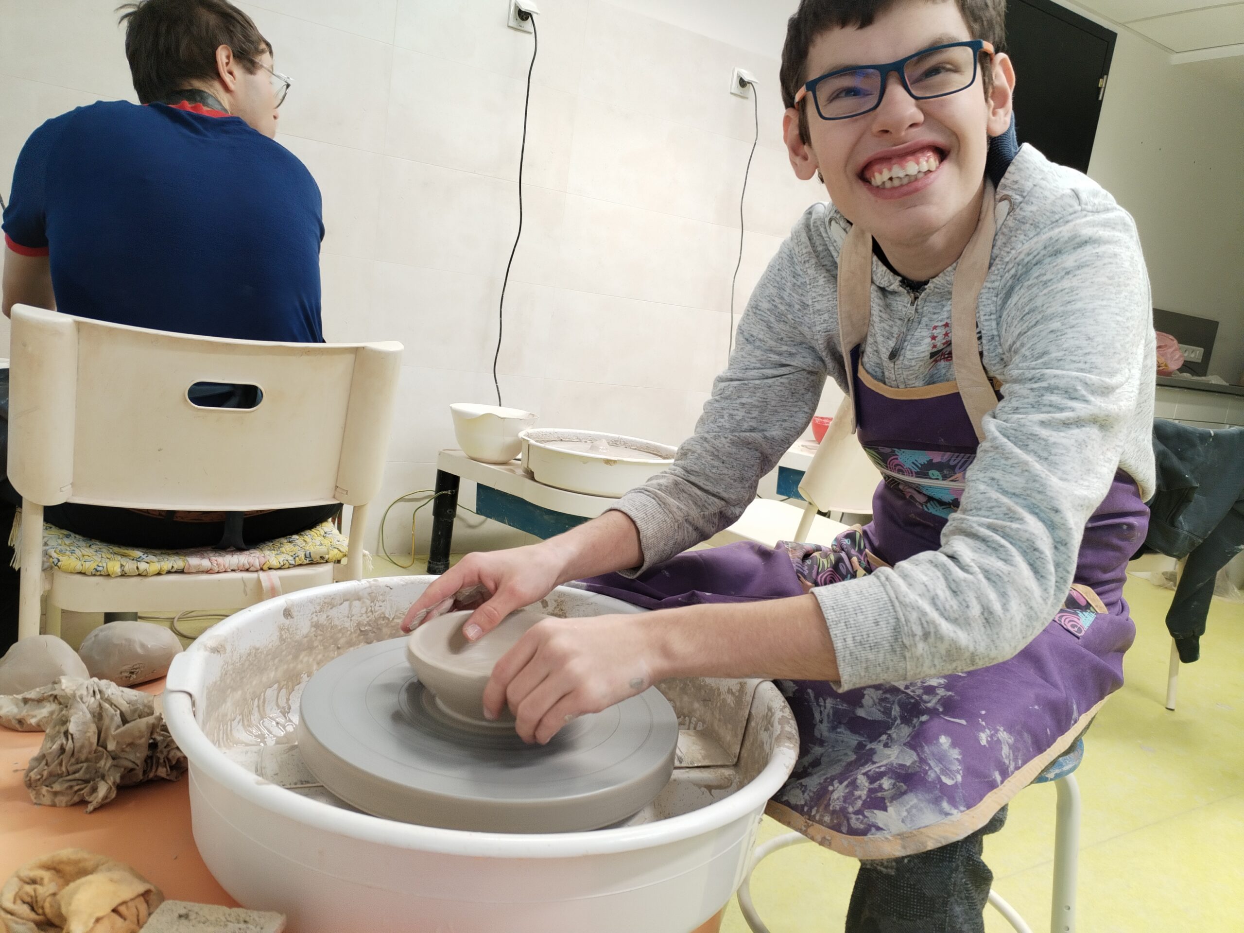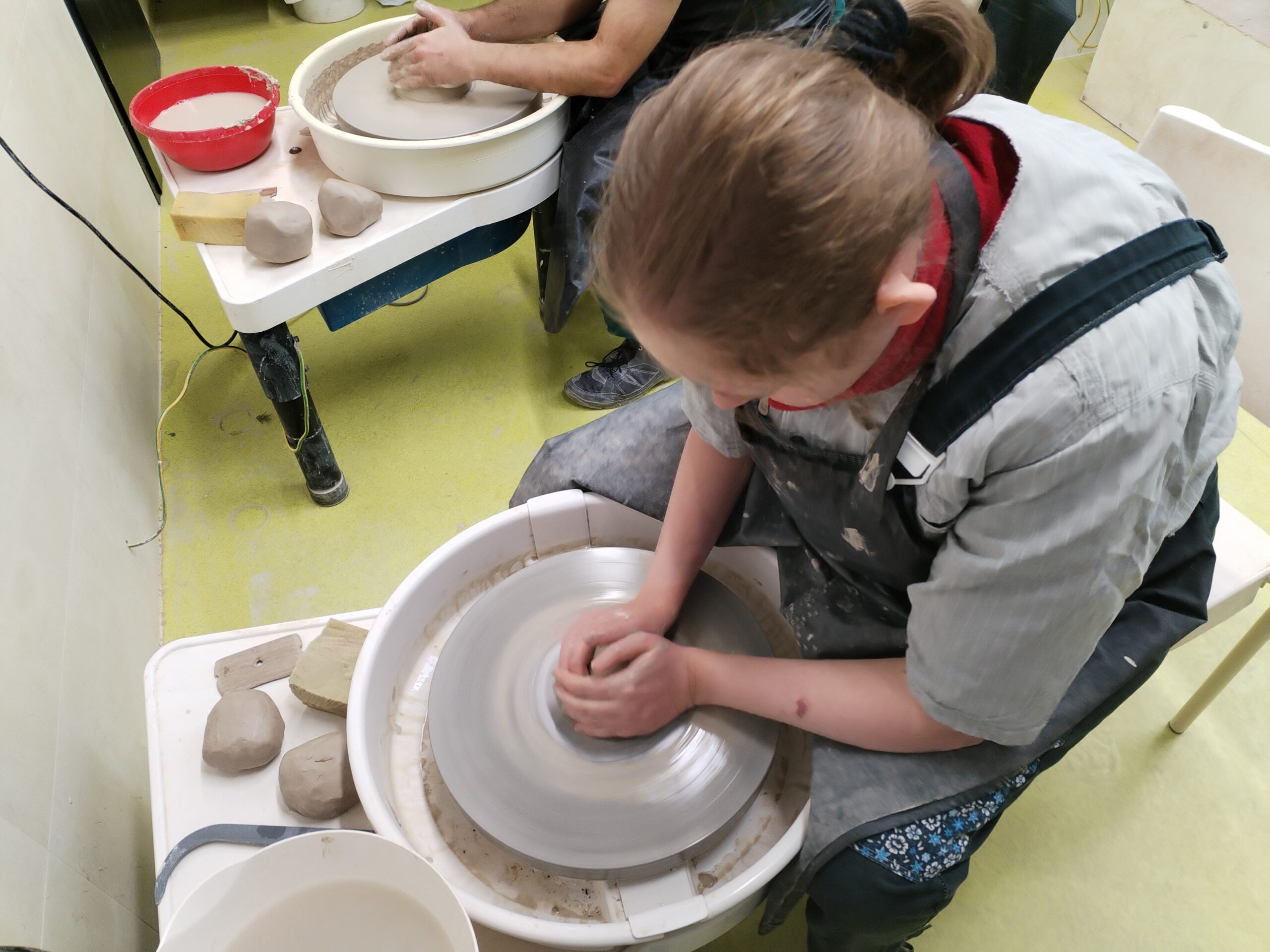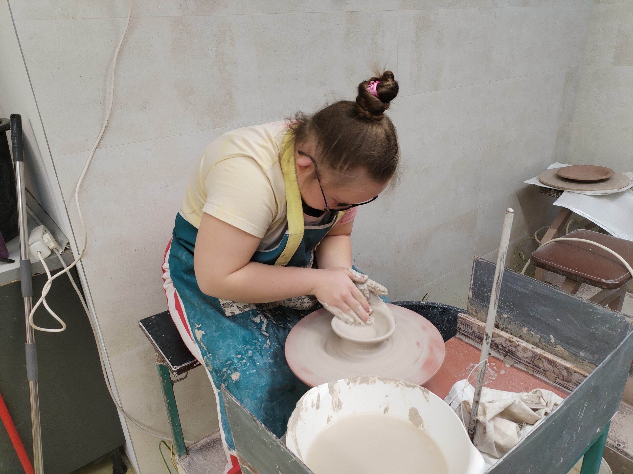 V rámci všech ročníků docházíme jednou týdně do točírny, kde se věnujeme práci na hrnčířském kruhu. Postupně se učíme základní hmaty, správné držení rukou i techniku centrování hlíny. Právě dobrý „centr“ je pro další práci klíčový, a proto se snažíme o co nejlepší zvládnutí této dovednosti.