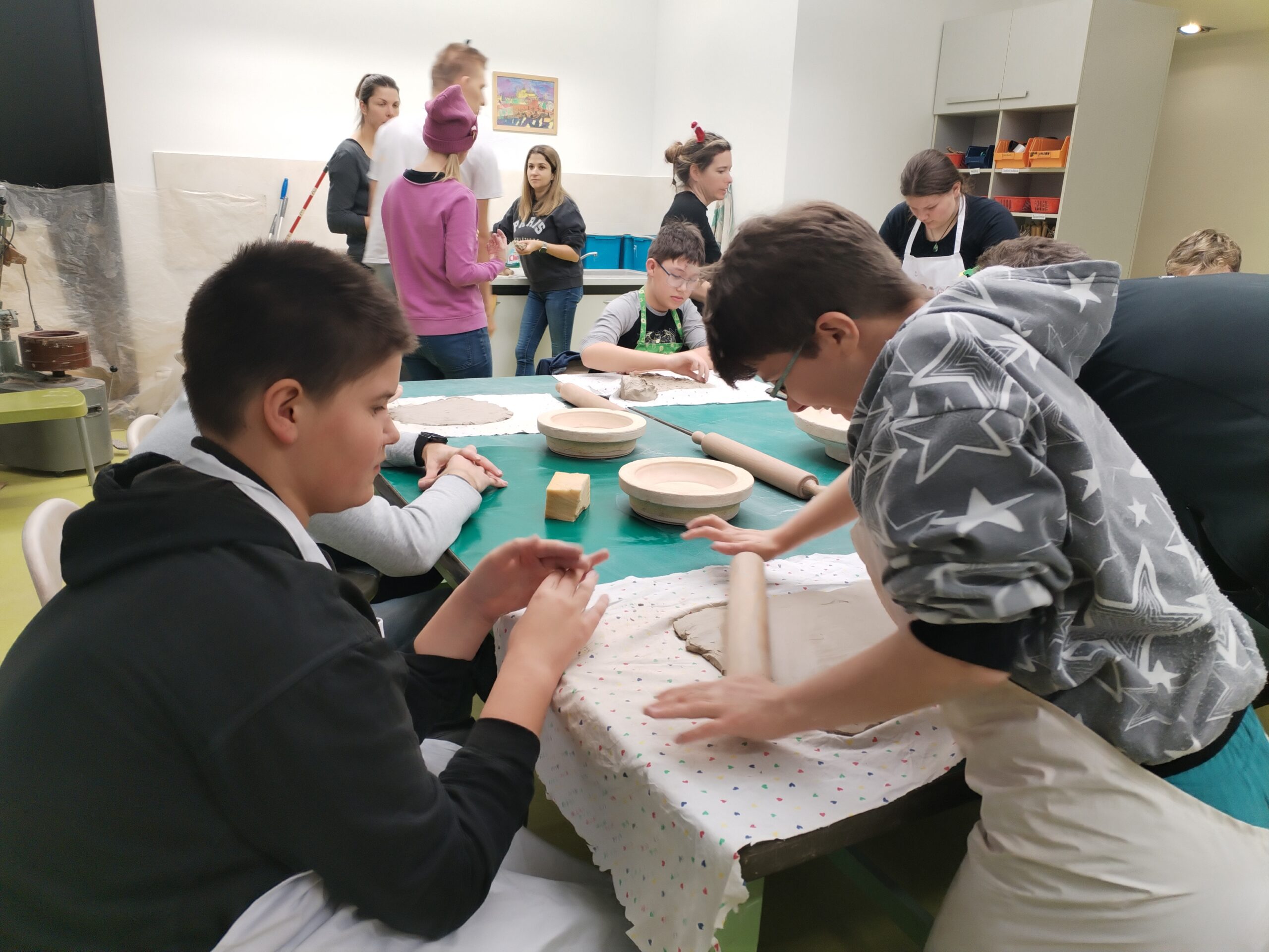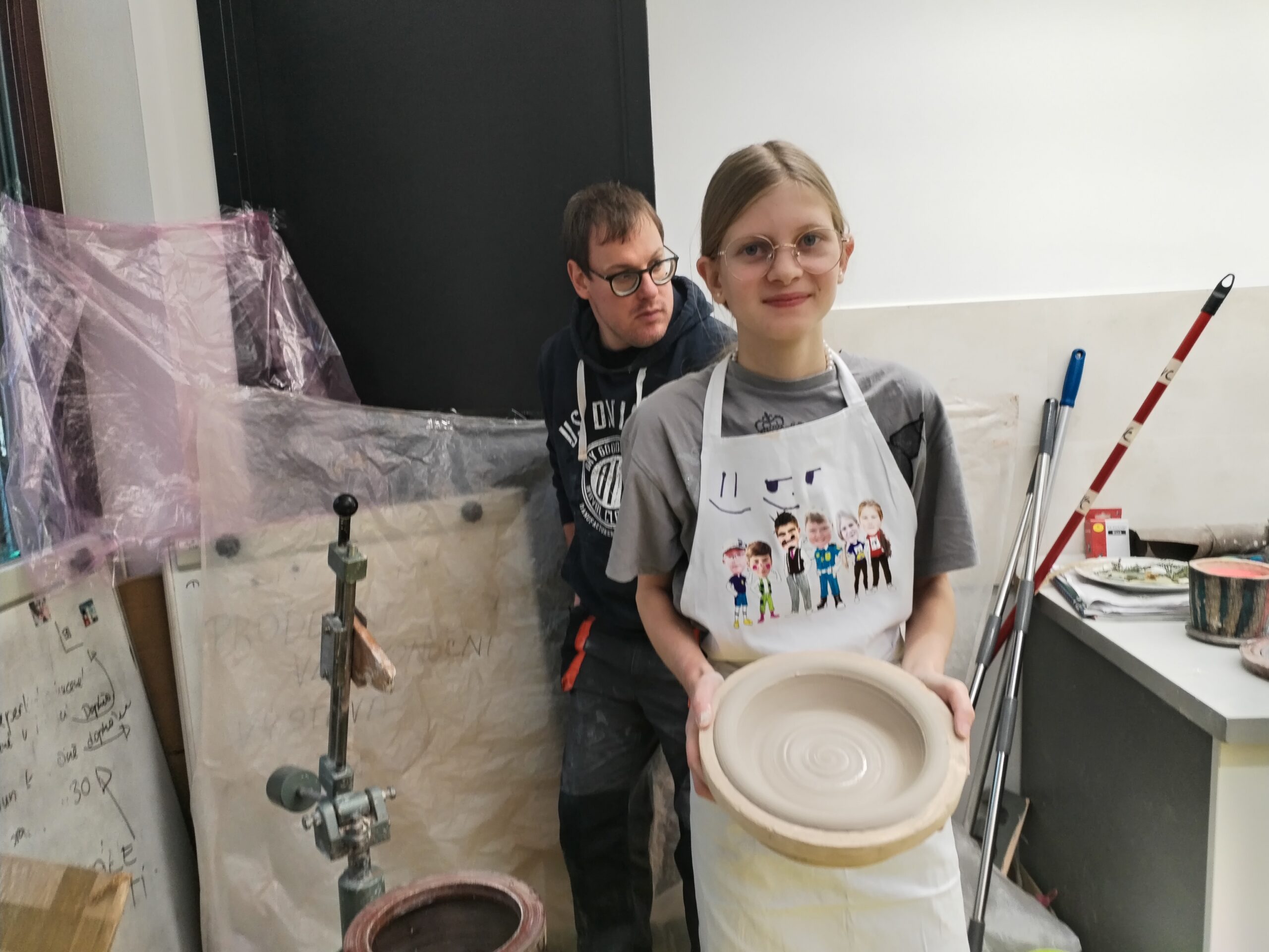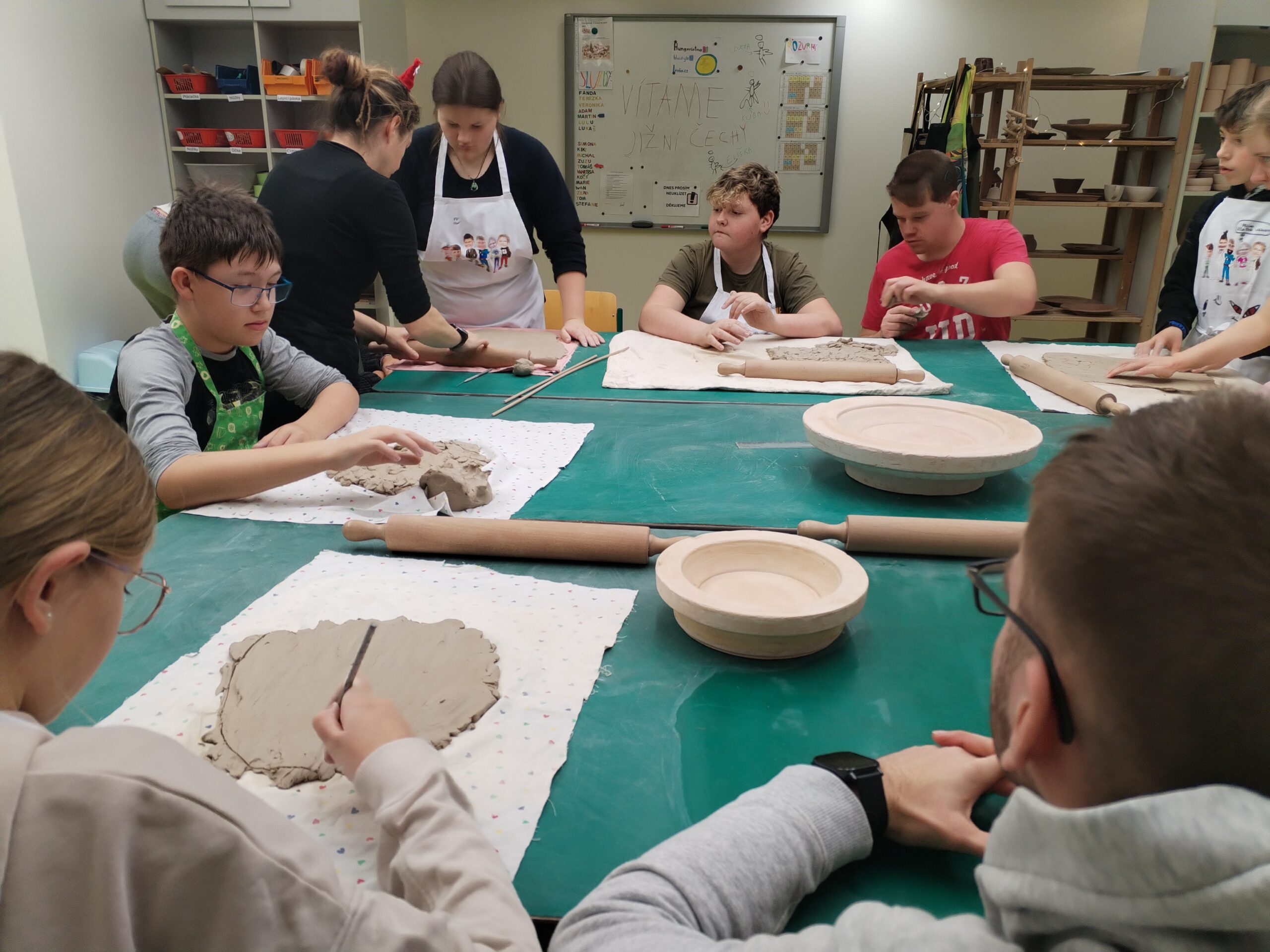 Díky domluvě pana ředitele proběhlo setkání našich žáků se začínajícími keramiky ze ZŠ Cehnice. Po příjezdu hostů se hned rozběhla plánovaná akce. Nejprve si žáci z keramické hmoty vymodelovali plát, který následně přenesli na sádrovou formu. Tu poté vložili do kruhu, kde vznikl talíř vytočený s vysokou přesností. Při práci jsme využívali různé keramické pomůcky, například očko nebo houbičku.