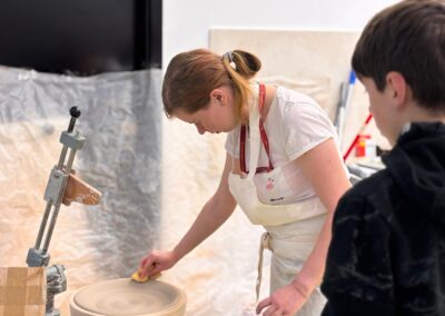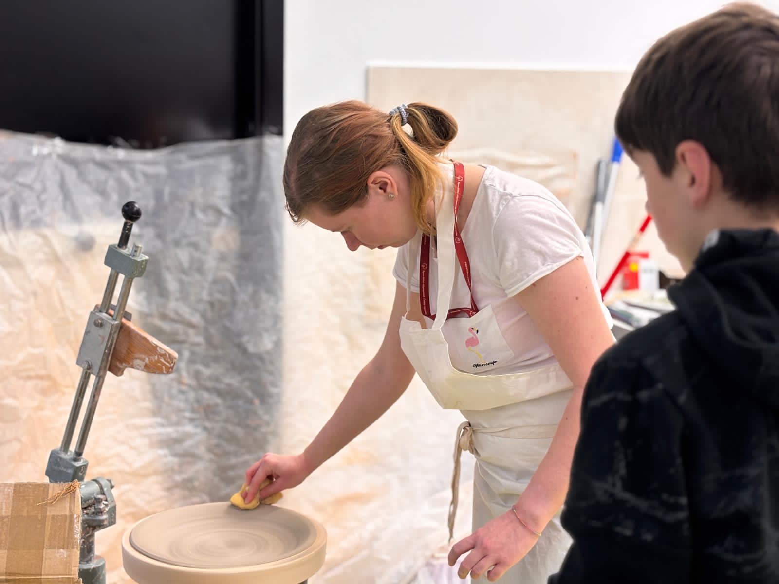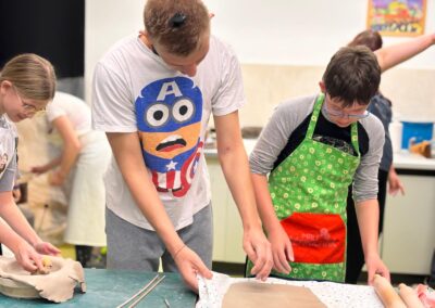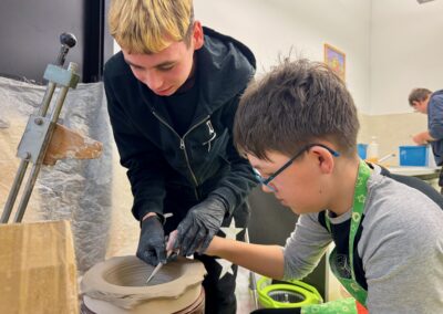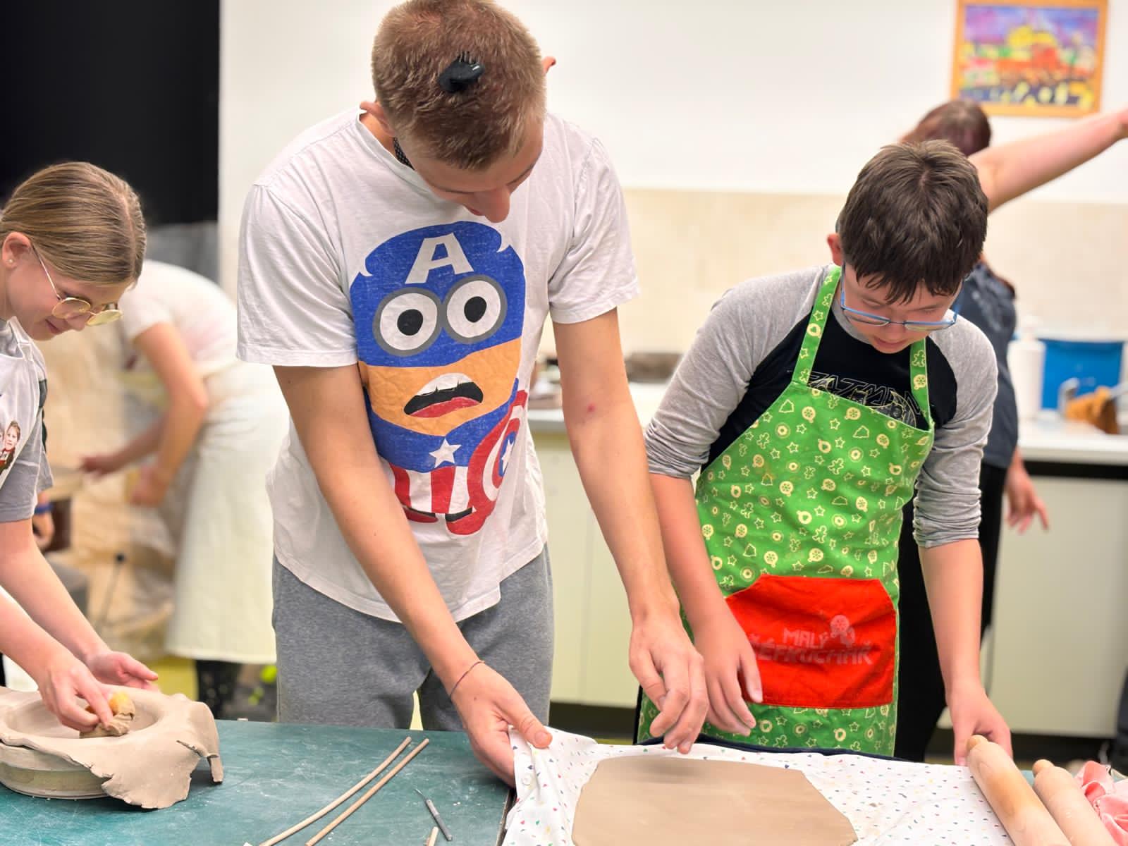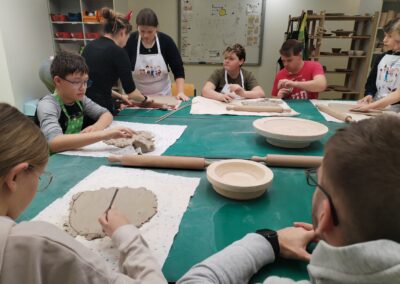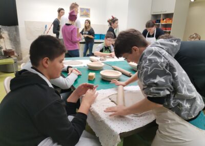 Díky domluvě pana ředitele proběhlo setkání našich žáků se začínajícími keramiky ze ZŠ Cehnice. Po příjezdu hostů se hned rozběhla plánovaná akce. Nejprve si žáci z keramické hmoty vymodelovali plát, který následně přenesli na sádrovou formu. Tu poté vložili do kruhu, kde vznikl talíř vytočený s vysokou přesností. Při práci jsme využívali různé keramické pomůcky, například očko nebo houbičku.