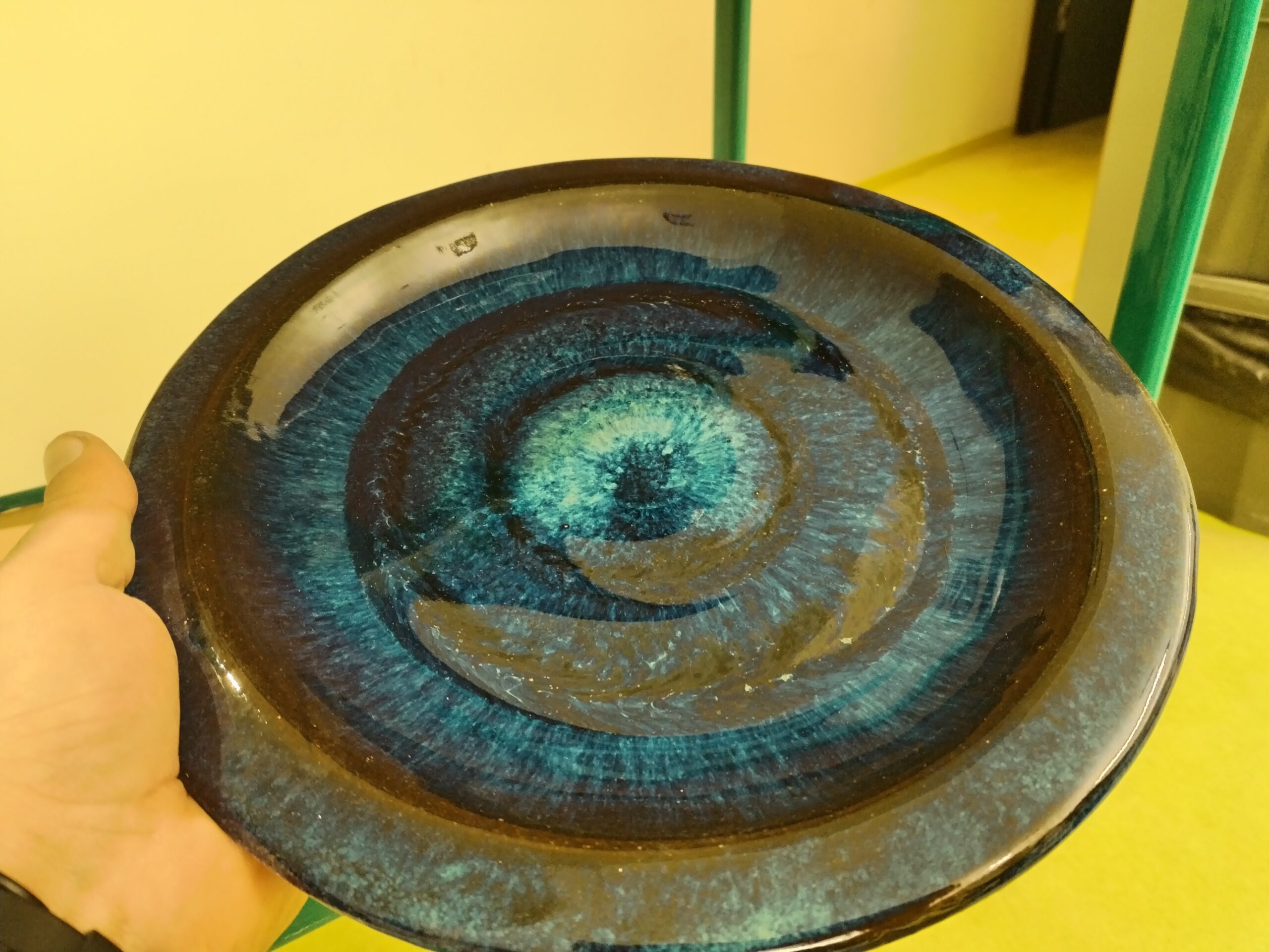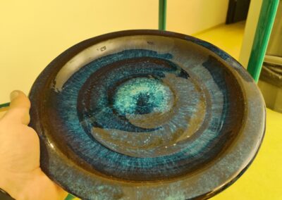Druhá část workshopu byla věnována retušování již uschnutých talířů – broušení hran keramickým nožíkem a jemnému zatírání povrchu navlhčenou houbičkou. Ve třetí části přišlo na řadu glazování. Společně jsme si rozmíchali glazuru v odstínu akvamarín a talíře jsme glazurou polévali.